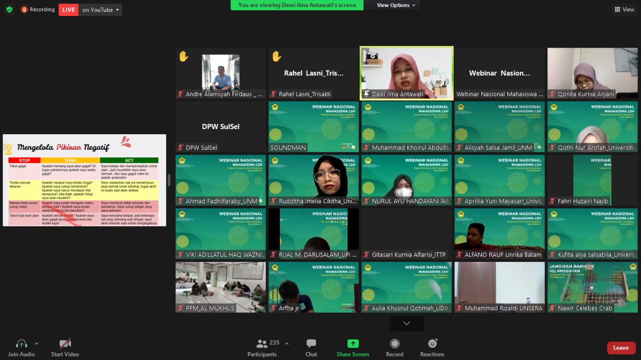 MAKASSAR, LINES – Dewan Pimpinan Wilayah (DPW) Lembaga Dakwah Islam Indonesia (LDII) Provinsi Sulawesi Selatan gandeng mahasiswa yang tergabung dalam Forum Dakwah Mahasiswa Islam (FDMI) Kota Makassar menyelenggarakan webinar cara mengatasi stres akademik via Zoom Cloud Meetings, Minggu (7/11/2021).