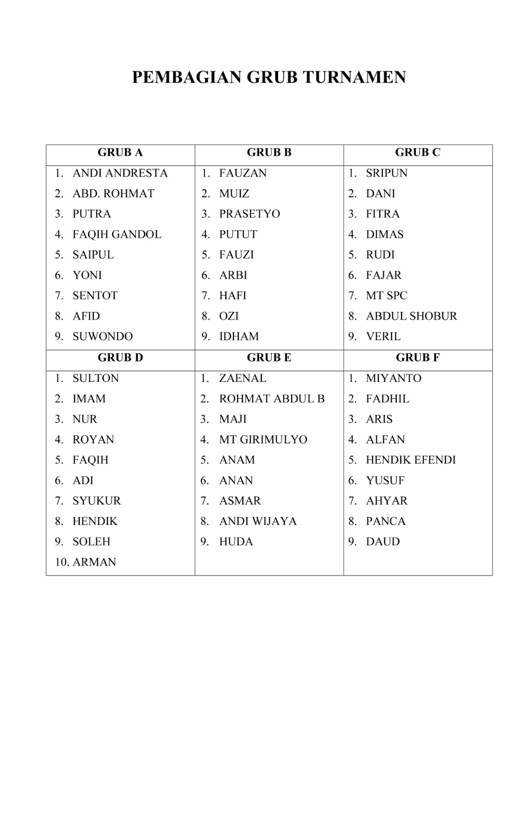 Selanjutnya, kegiatan ini akan berlangsung selama 2 (dua) hari kedepan. Pada turnamen ini diikuti oleh 6 (enam) Grup yang akan berjuang untuk memperebutkan Juara I. Masing-masing grup dihuni oleh kolaborasi pemain junior dan senior sehingga harapannya akan tercipta kerja sama yang baik sehingga akan mempererat tali silaturohim antar pemain.
