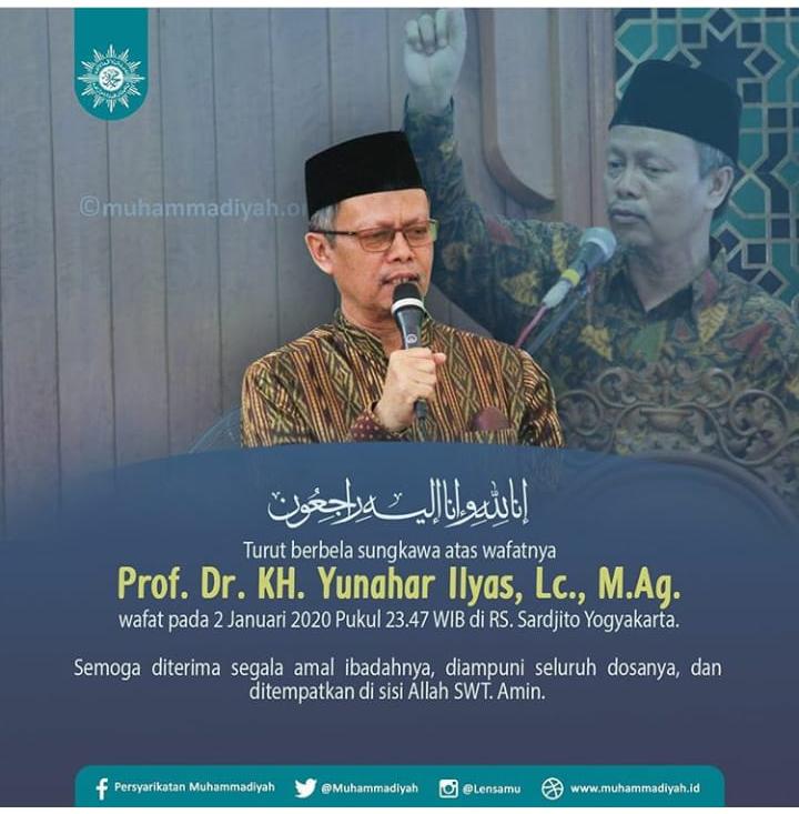 “Innalilahi wainna ilaihi rajiun, telah meninggal dunia Prof. Dr. KH. Yunahar Ilyas,Lc ketua Pimpinan Pusat Muhammadiyah pada tanggal 2 Januari pukul 23.47 di RS. Sarjito Yogyakarta,” kata Ketua PP Muhammadiyah, Agus Taufiqurrahman, seperti dikutip dari detik.com, Jumat (3/1/2020).