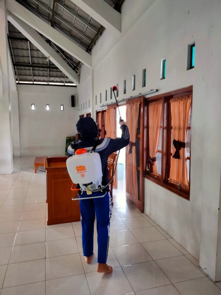 Tak lupa, masjid tempat ibadah pun juga dilakukan penyemprotan. Mulai dari dinding-dinding masjid, pintu, dan area sekitar masjid juga ikut disemprot. Selain itu, takmir masjid dan pengurus masjid menyediakan sabun cuci tangan di setiap tempat wudhu.