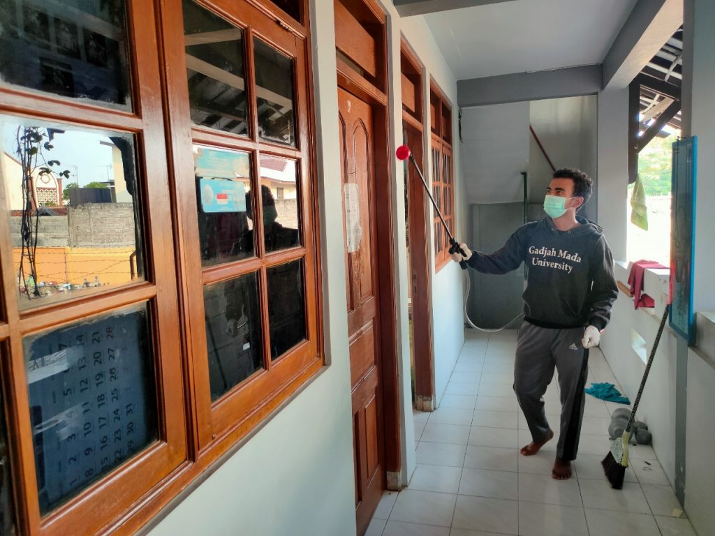 Setiap unit di griya mahasiswa -sebutan gedung asrama PPM- santrinya ikut melakukan penyemprotan disenfektan. Dengan menggunakan ADP (Alat Perlindung Diri) seperti masker dan sarung tangan lateks, para santri antusias menyemprot disetiap bagian sudut bangunan.