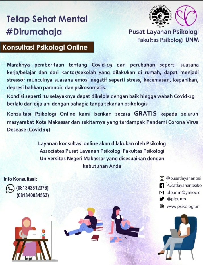 MAKASSAR, LINES.id – Psikolog Associates Universitas Negeri Makassar (UNM) di bawah Pusat Layanan Psikologi Fakultas Psikologi UNM mengadakan layanan konsultasi psikologi online secara gratis. Bertajuk Tetap Sehat Mental #dirumahaja kepada masyarakat kota Makassar dan sekitarnya yang terdampak pandemi Corona Virus Desease (Covid-19).