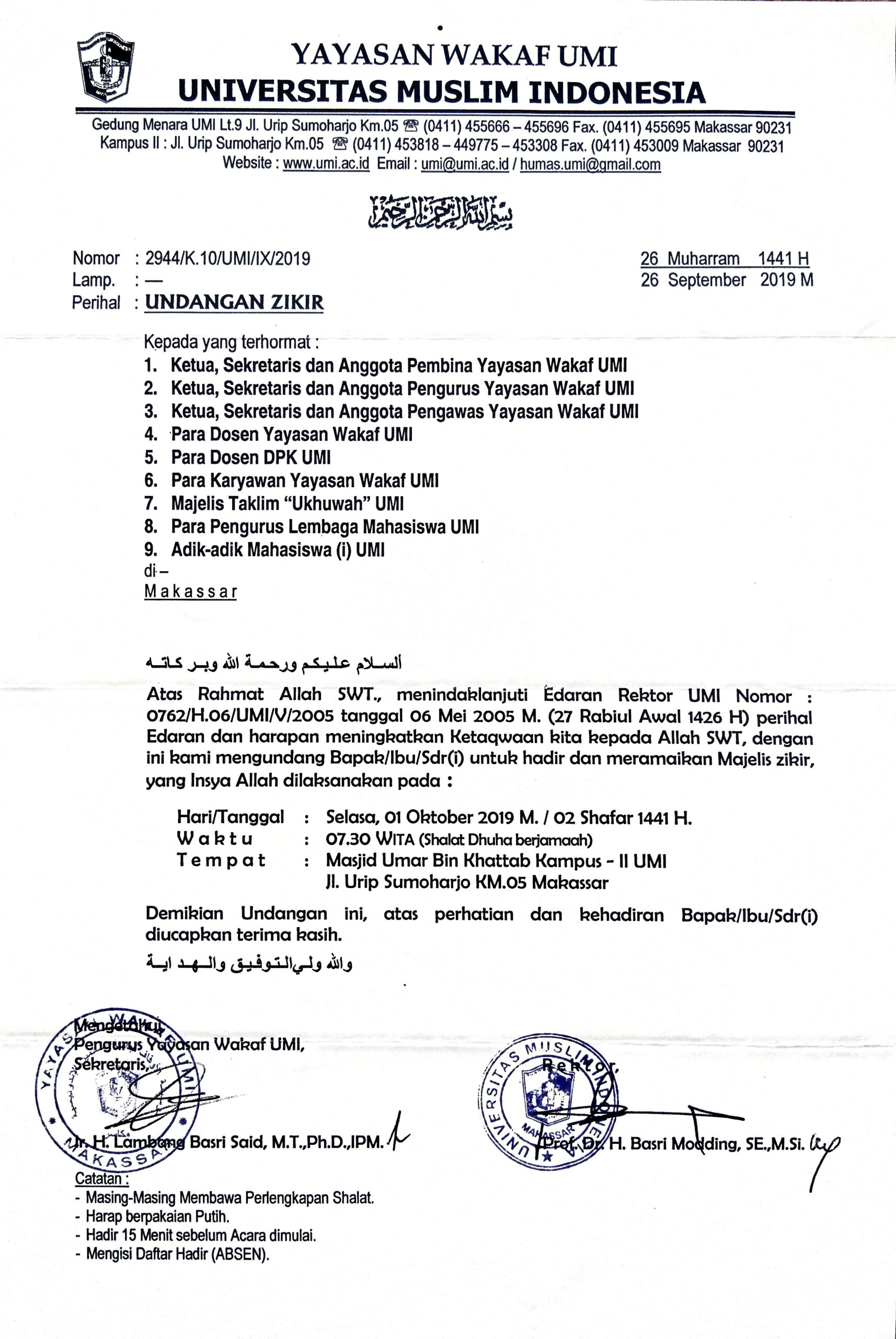 Sivitas akademika Universitas Muslim Indonesia (UMI) akan gelar Zikir Akbar di masjid Umar Bin Khattab Kampus 2 UMI Jl. Urip Sumoharjo Km. 05 Makassar.